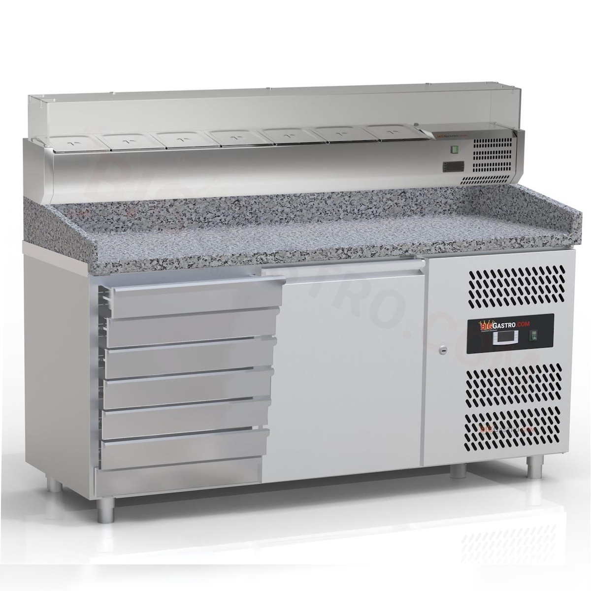 Pizzakühltisch - Pizzatisch mit 1 Tür und 7 Schubladen inkl. Glaskühlaufsatzvitrine für 1/4 GN Behälter - IDEAL graue Granitarbeitsplatte