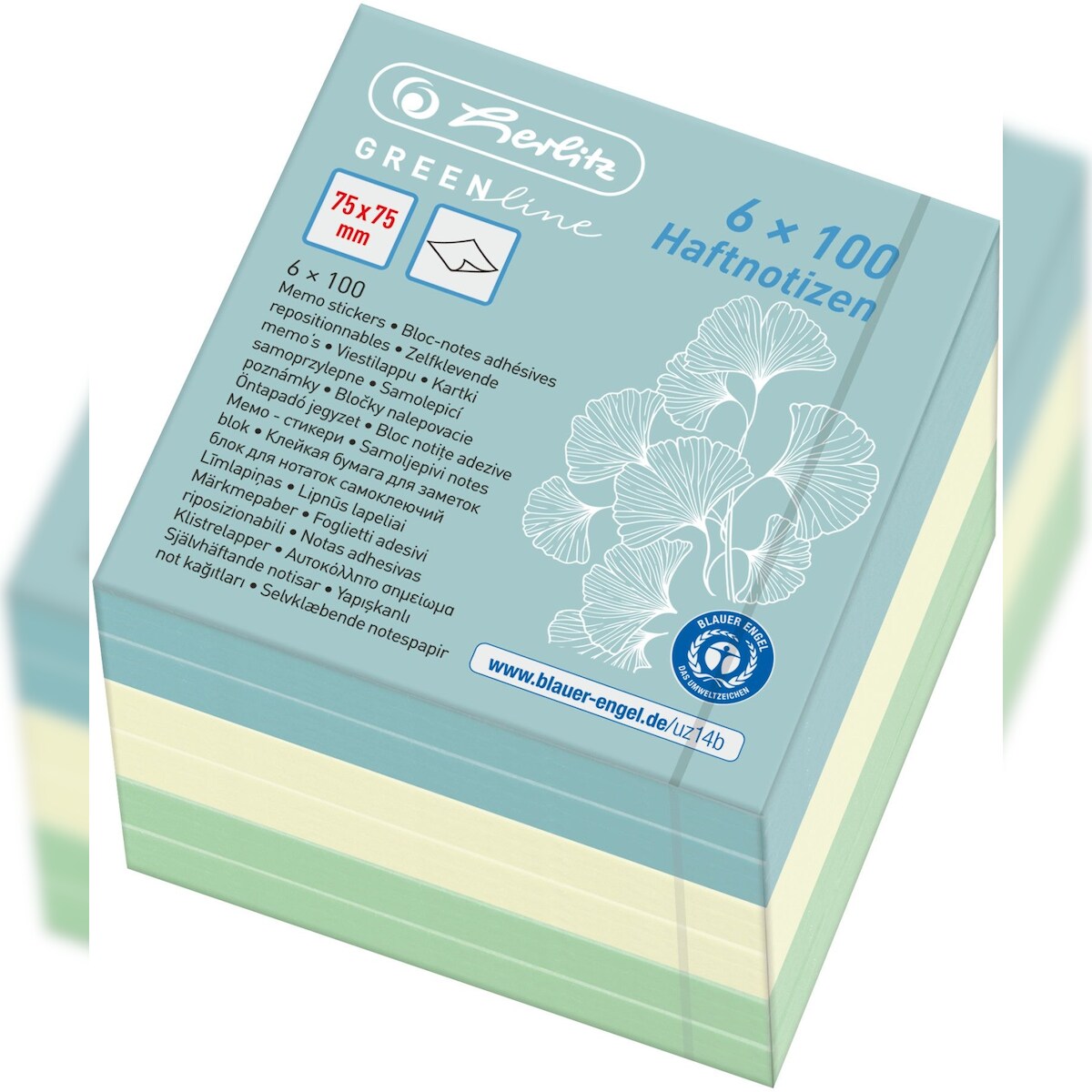 herlitz Haftnotizblock 75x75mm Greenline farbig sortiert Farbmix 6x100 Blatt Packung mit 24 Stück
