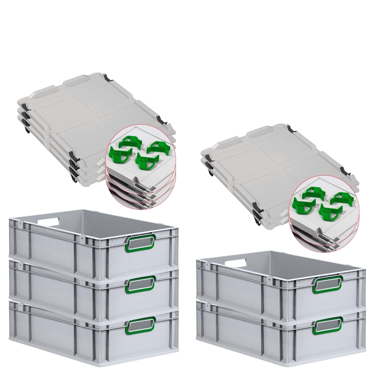PROREGAL SuperSparSet 5x Eurobox NextGen Color mit Auflagedeckel & Verschlüsse, HxBxT 17x40x60cm, 34L, Grau, Griffe grün offen, Eurobehälter, Box