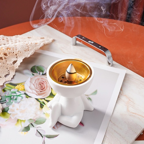 1 bruciatore di incenso decorativo per la casa in resina con una piccola figura seduta su un ginocchio. Questo prodotto per incenso è realizzato in resina con una piccola figura seduta su un ginocchio