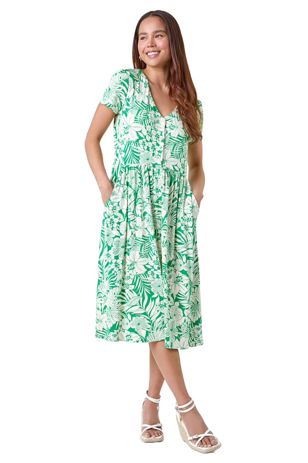 Roman Womens Petite Tropical Button Pocket Midi Dress - Green - Size 10 UK | Roman Sale | Discount Designer Brands