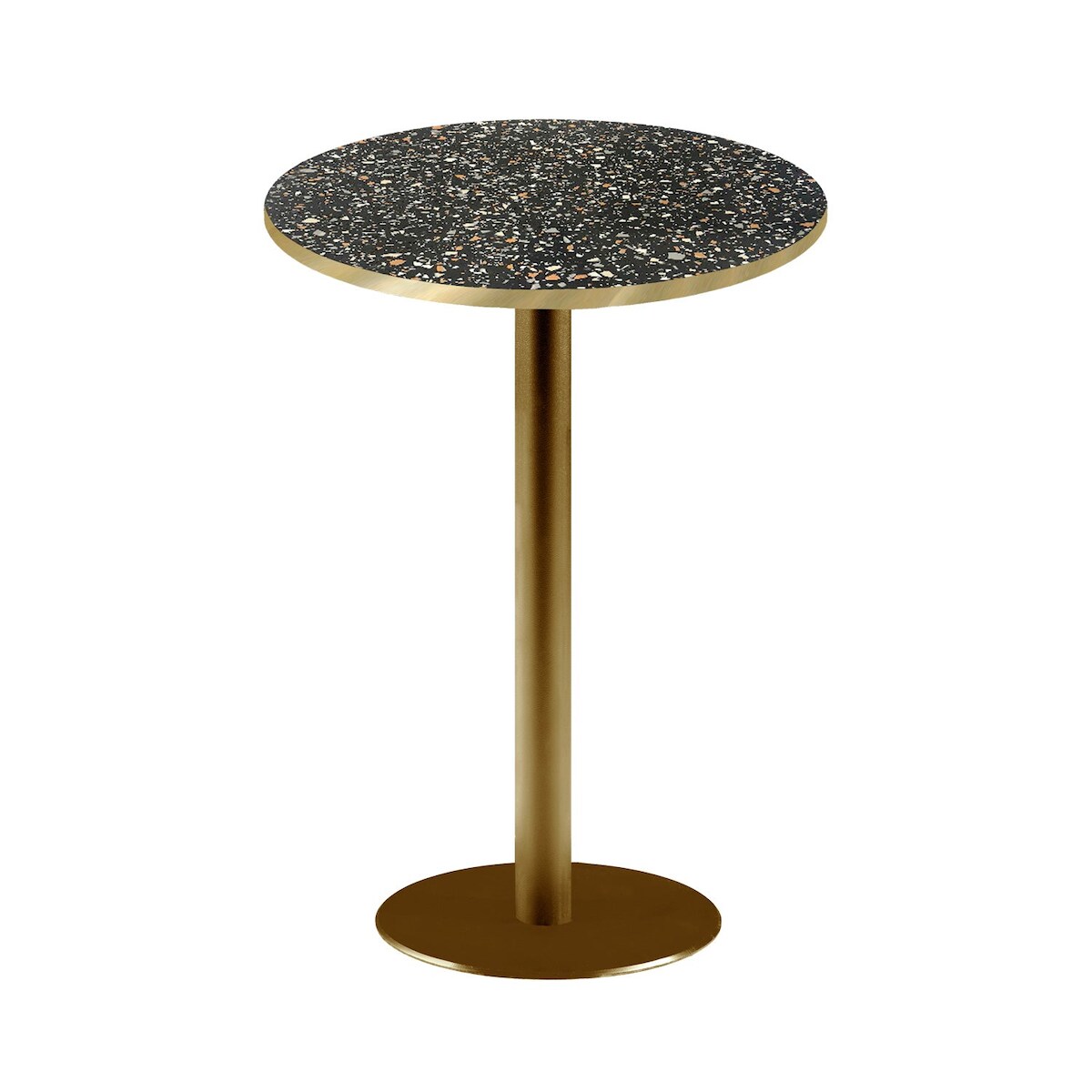 RestooTab - Stehtisch Rome goldmetallic Ø60 Dekor Terrazzo black chip Kanten messingfarben