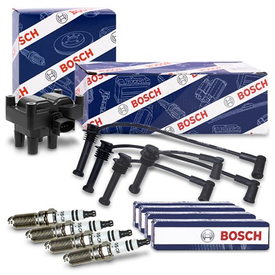 Bosch Zündspule + Zündleitungssatz + 4x Zündkerzen [Hersteller-Nr. 40208045] für Ford