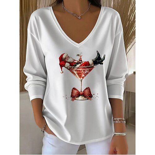 Natale Per donna Maglietta Grafico Babbo Natale Natale Vintage Elegante Classico Manica Lunga Scollo a V Top Regolari Quotidiano Stampato Nero Bianco Rosso Verde Grigio Primavera Autunno Inverno