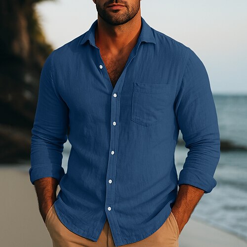 Per uomo Camicia in cotone e lino Semplice Vacanza Casuale Nero Bianco Blu Manica Lunga Bavero Primavera Estate Abbigliamento