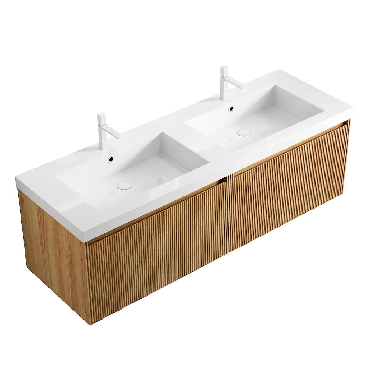 MODFU Waschtisch 45×140×46 cm mit 2 Waschbecken aus Resin und Sperrholzschrank in Eichenoptik, Weiß, vorinstalliert