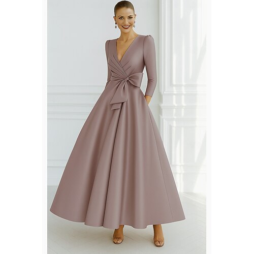 Abito da Sera A-Line Elegante Ospite di Nozze Formale Lunghezza Piena Manica 3/4 Collo a V Con Tasche Stretch Satin con Fiocco(i)