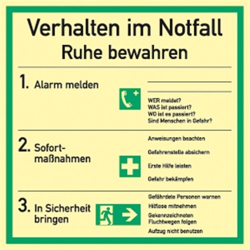 Aufkleber Verhalten im Notfall ISO 7010, Folie, langnachleuchtend, 180x180 mm
