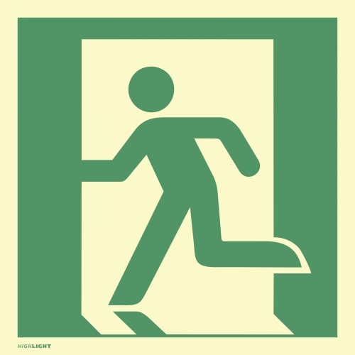 Aufkleber Notausgang links, ISO 7010, PVC-U selbstklebend, nachleucht.,160-mcd, 200x200 mm
