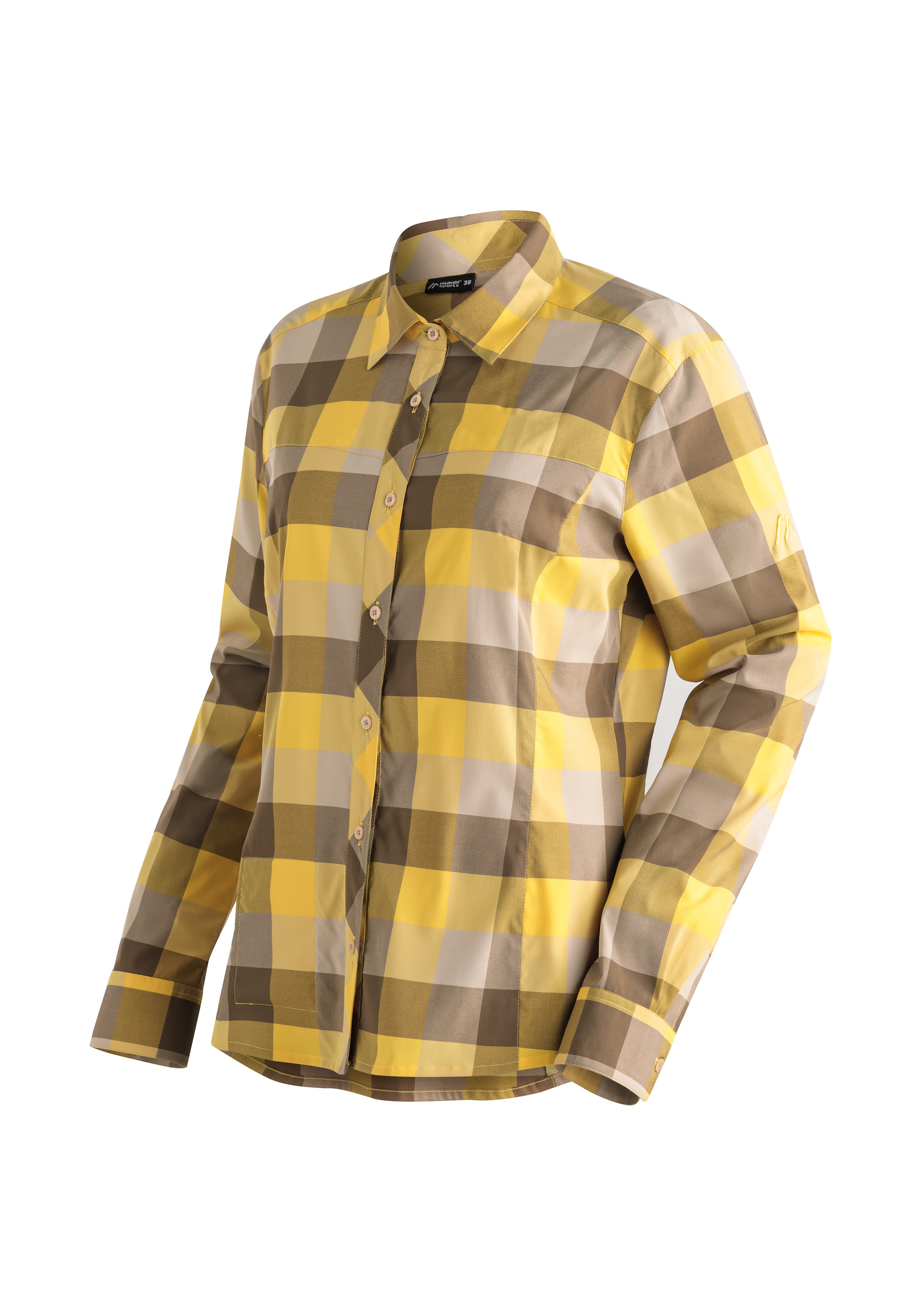 Outdoorbluse MAIER SPORTS "Kendra L/S W", Damen, Gr. 42, gelb (zartgelb), 97% Polyester, 3% Elasthan, Langarm, Blusen, Damen Langarmbluse, pflegeleichte Karobluse