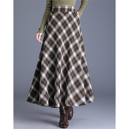 Per donna Gonna scozzese Gonna Lunga Elegante Retrò Vintage Maxi Vita Alta Gonne Plaid Blocco di colori Tasca Lungo Micro-elastico Quotidiano Casual Quotidiano Blu scuro Caffè Autunno 100% Poliestere