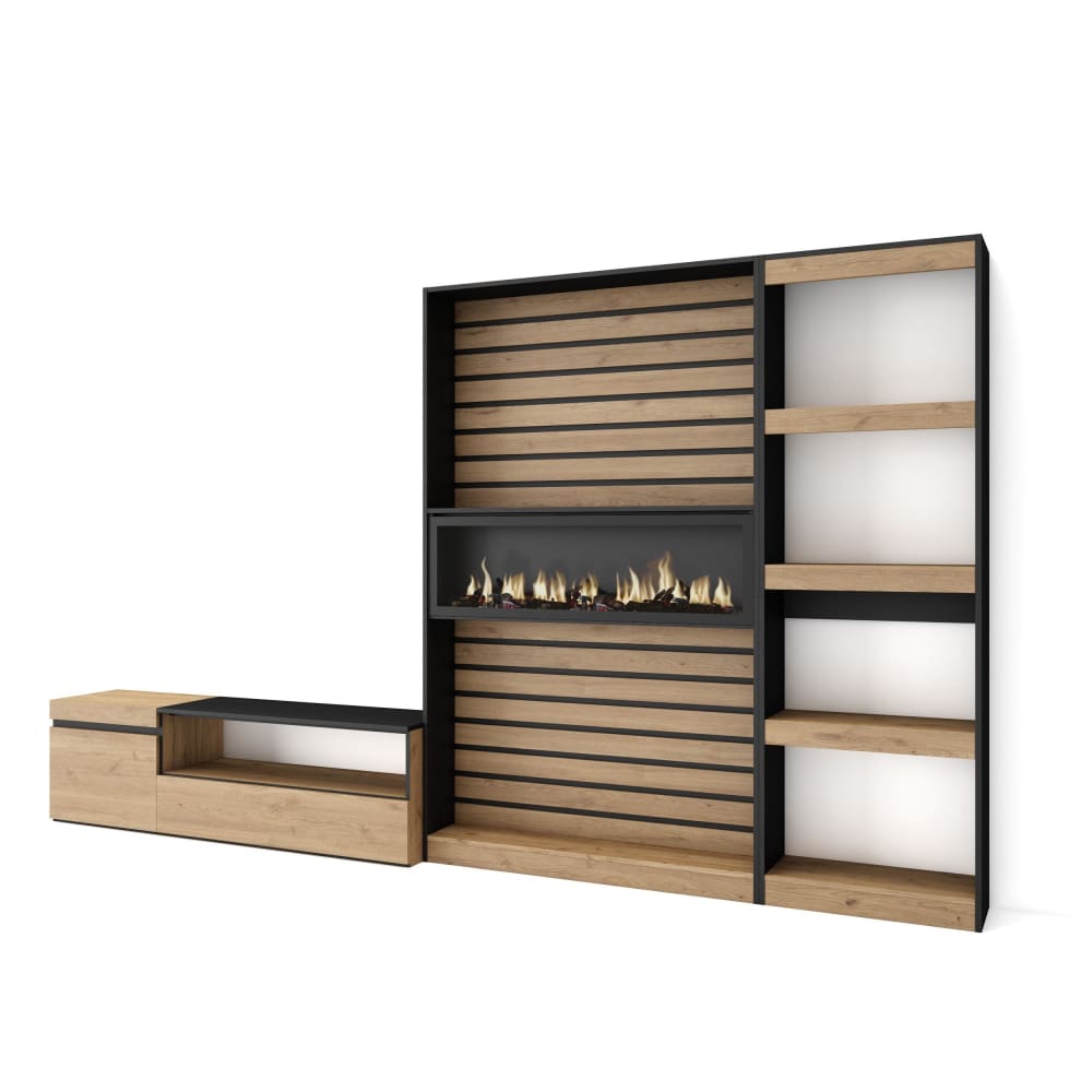 Mobile TV effetto legno rovere nero camino effetto fuoco 320x35x186cm