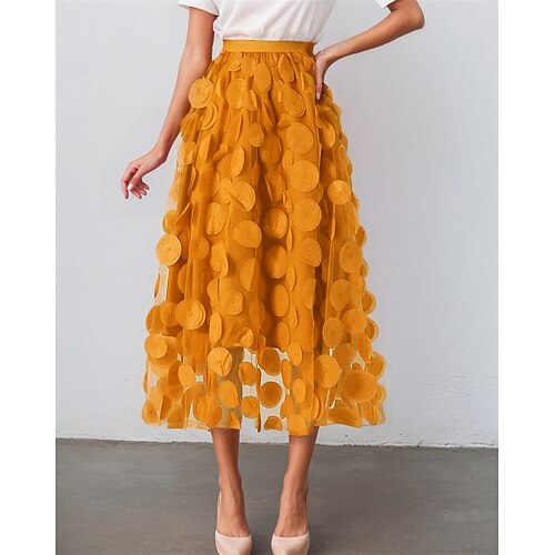 Per donna Taglia standard asiatici Linea A Gonne di garza Elegante Moda Midi Vita Alta Gonne Tinta unita Floreale Tulle Micro-elastico Riunione di famiglia Casual Quotidiano Aalbicocca Rosso bordeaux