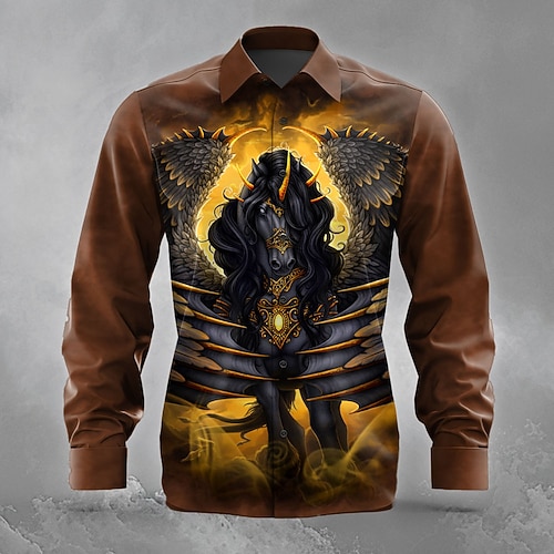 Per uomo Animale Cavallo Ali Camicia Camicia con Bottoni Manica Lunga Stile gotico oscuro Ferie Abbigliamento casual alla moda Estate Primavera Collo ripiegato Stampa 3D camicie con colletto Nero