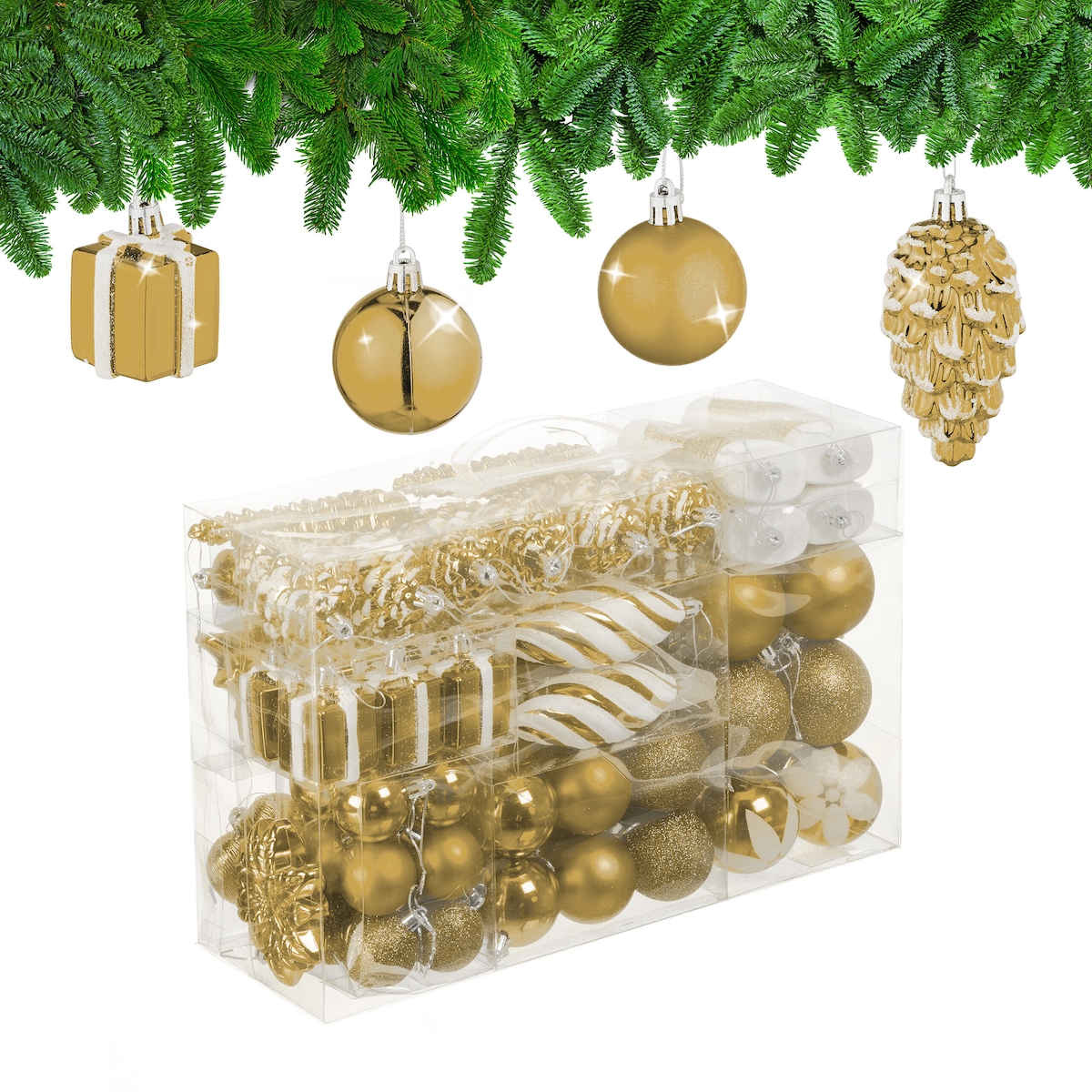 Relaxdays Weihnachtskugeln 72er Set, glitzernde, matte & glänzende Baumkugeln, Stiefel, Herz & Zapfen, Kunststoff, gold