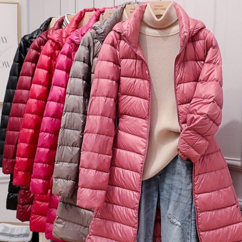 Lätt Tunn Dunjacka Dam Mellång Längd Höst och Vinter Huva Plus Size Jacka Avtagbar Hatt cm khaki