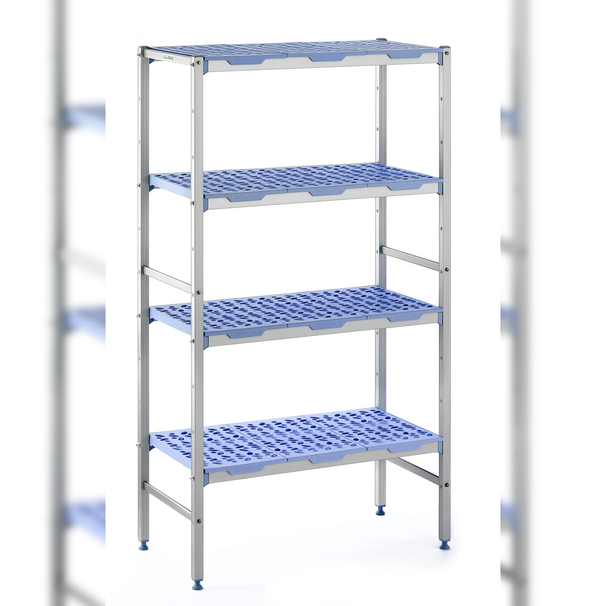 Tournus Aluregal mit gelochten Kunststoffauflagen: 690mm lang, 500mm tief, 1750mm hoch, 4 Ebenen Tragkraft: 200 kg / Ebene