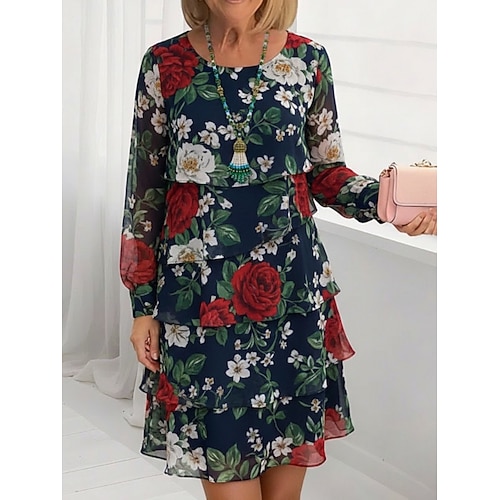 Per donna Mini Abito Vestito Casual Vestito in Chiffon Abito a Tubino Elegante Moda Moderno Quotidiano All'aperto Weekend Vestibilità regolare Floreale Manica Lunga Girocollo Blu marino Estate