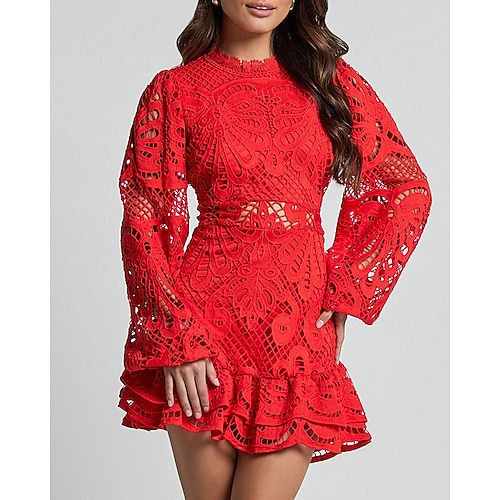 Per donna Mini Abito Abito nero Abito in Pizzo Abito ritagliato Tubino Moda Moderno Manica a rete Manica a Lanterna Ufficio Uscire Vestibilità regolare Floreale Manica Lunga Collo alla coreana Blu