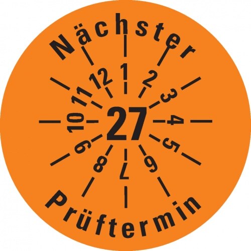 Dreifke® Prüfplakette Nächster Prüftermin 27, orange, Dokumentenfolie, Ø 30mm, 18 St/Bogen