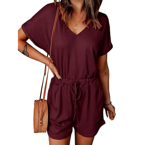 Per donna Normale Pagliaccetto Attivo Tinta unica Manica Corta Pantaloncini larghi Scollo a V Tasca Con Cintura Quotidiano Vacanza Vestibilità regolare Vino Blu marino Viola Estate