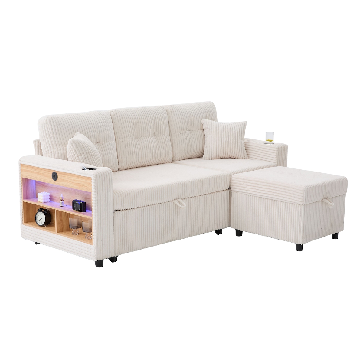 Merax 3-Sitzer-Schlafsofa mit Schlaffunktion, Mehrfunktionales Cord-Sofa mit Stauraum & Ausziehbett. Inkl. USB-C, Beige