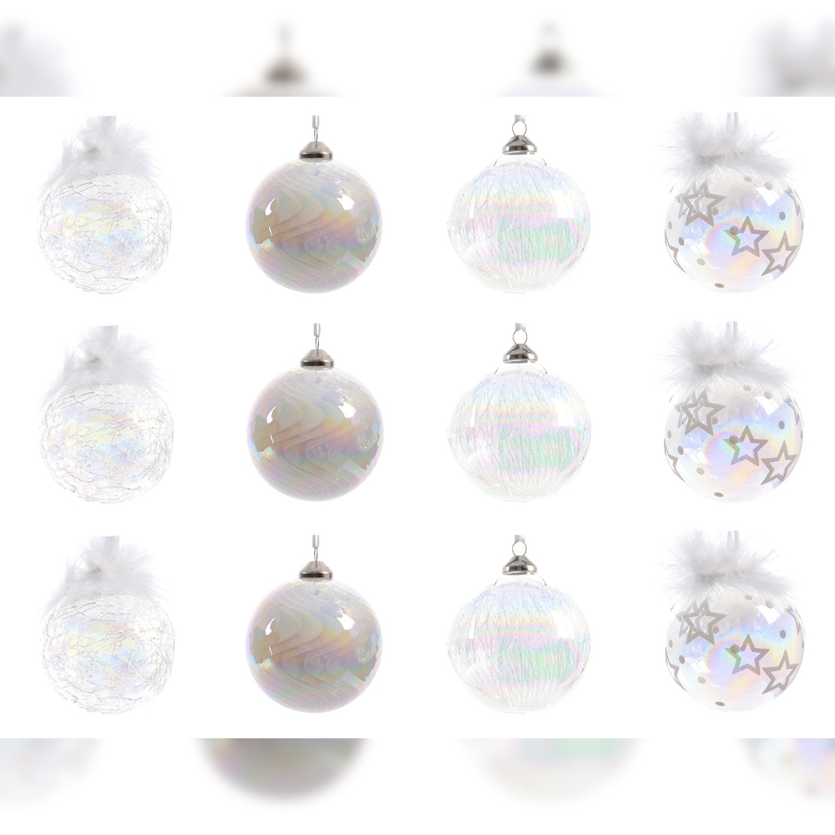 12 Weihnachtskugeln 8cm Glas mit Federn Christbaumkugeln Weihnachtsbaumkugeln Christbaumschmuck Weihnachtsbaumschmuck Deko Klar / Weiß Irisierend