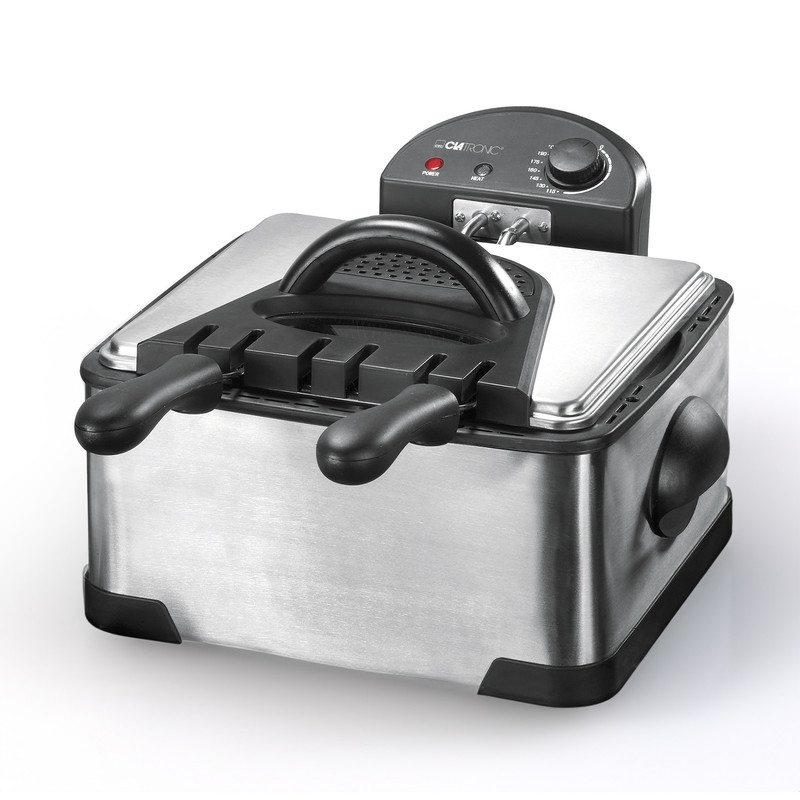Clatronic FR 3195 Elektrische Doppelfritteuse, 4 L, Edelstahl, 2 kleine und 1 großer Korb, abnehmbar, 2000W, Nero/Argento