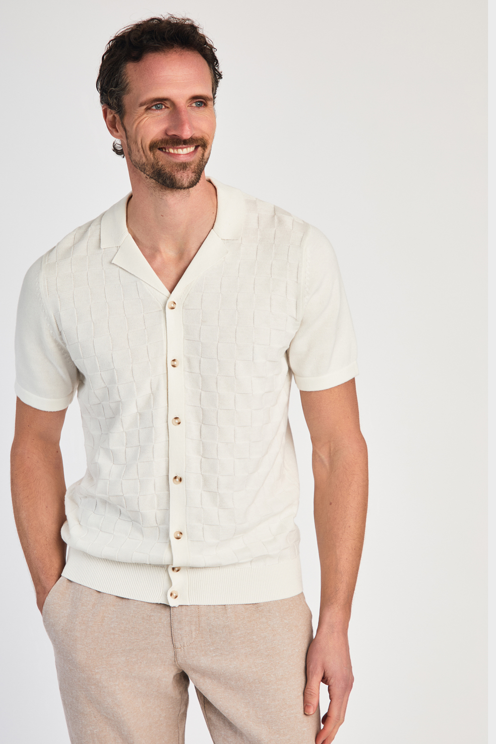 Nines Mens Ecru Cotton Knitted Check Shirt - Size X-large | Nines Sale | Discount Designer Brands