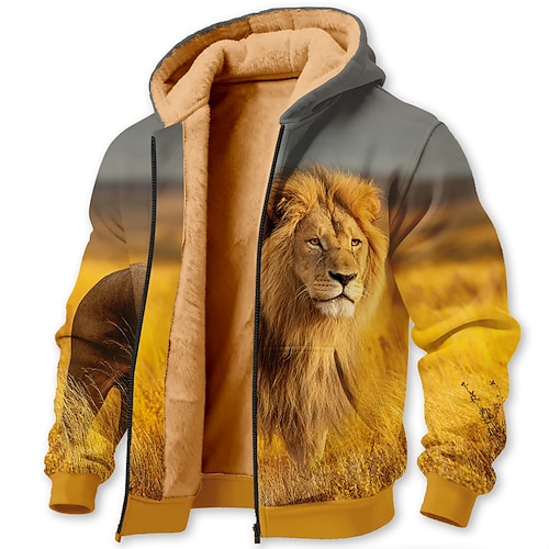 Per uomo Leone 3D Pile Felpa con Cappuccio Giacca di pelle Felpa Classico Militare Da caccia Girocollo All'aperto Campeggio Giallo Con zip Autunno Inverno progettista S M L XL 2XL 3XL