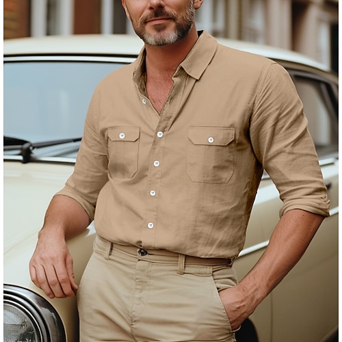 Per uomo Camicia Camicia in lino e cotone Camicia estiva Camicia con bottoni Liscio Informale Giornaliero Nero Bianco Blu Cachi Manica lunga Colletto Primavera estate Abbigliamento Tasche