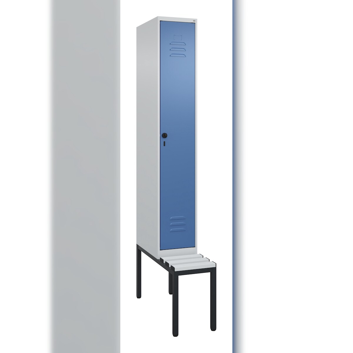 C+P Spind Classic PLUS, Kunststoff untergebaute Sitzbank, 1 Abteil, HxBxT 212x30x82cm, Sicherheitsdrehriegel, Hellgrau/Fernblau von PROREGAL