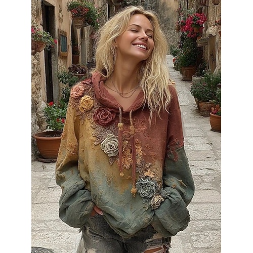 Felpa con cappuccio vintage boho 3D stampata per donna felpa patchwork felpa con cappuccio floreale felpa a maglione oversize casual calda attiva cappuccio abbigliamento quotidiano da strada