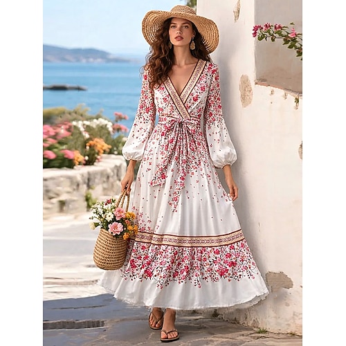 Per donna Abito maxi Abito a trapezio Casual All'aperto Uscire Vestibilità regolare Floreale Grafico Manica Lunga Scollo a V Fucsia Estate Primavera Autunno