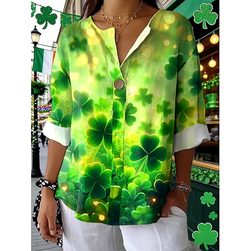 Festa di San Patrizio Per donna Camicia Grafico Trifoglio Quotidiano Manica Lunga Scollo a V Top lunghi Quotidiano Ferie Stampato Arancione Verde Estate Primavera