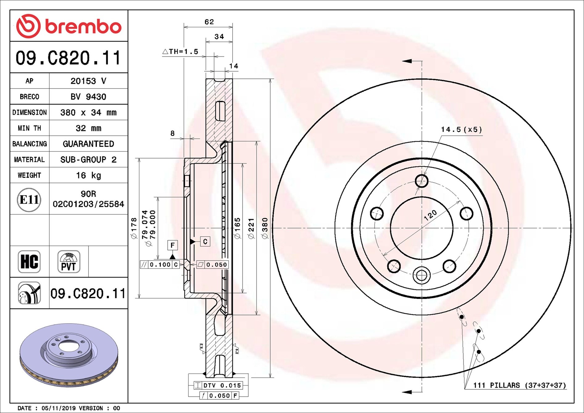 BREMBO Bremsscheibe 09.C820.11 vorne rechts links innenbelüftet 380mm für LAND ROVER LR161894 LR098968