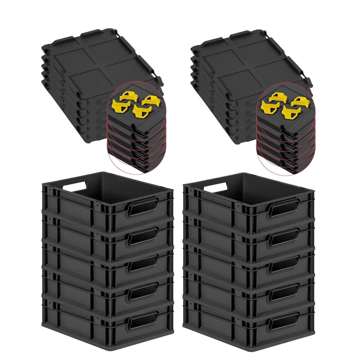 PROREGAL SuperSparSet 10x Eurobox NextGen Grip mit Scharnierdeckel & gelben Verschlüssen, HxBxT 12x30x40cm, 11L, Schwarz, Griffe offen, Eurobehälter