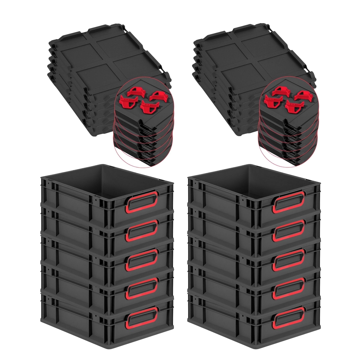PROREGAL SparSet 10x Eurobox NextGen Color mit Auflagedeckel & Verschlüsse, HxBxT 12x30x40cm, 11L, Schwarz, Griffe rot zu, Eurobehälter
