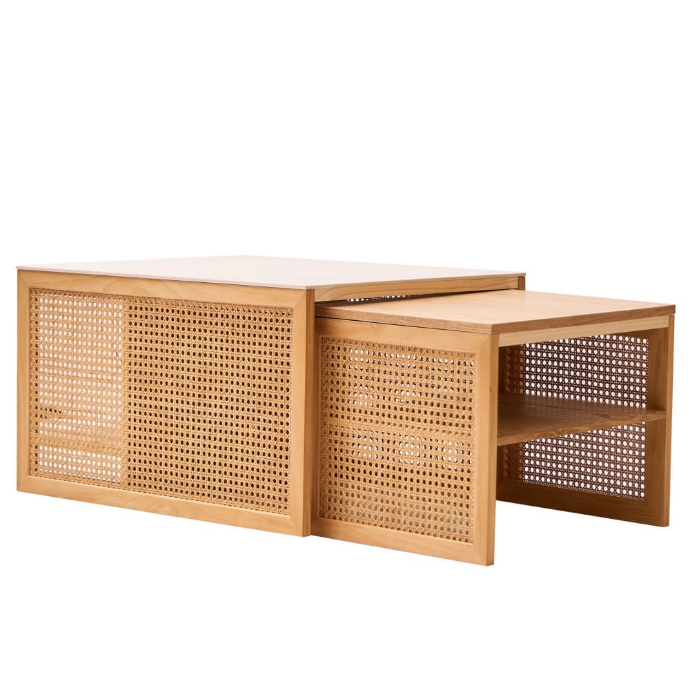 Set de 2 tables basses gigognes en rotin et plateau effet marbre