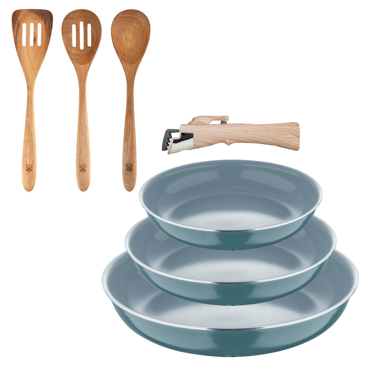 BERGNER - Set aus 3 Pfannen Ø18/20/24 cm recyceltes gepresstes Aluminium Grün mit abnehmbarem Griff mit Set aus 3 Küchenutensilien aus Akazienholz