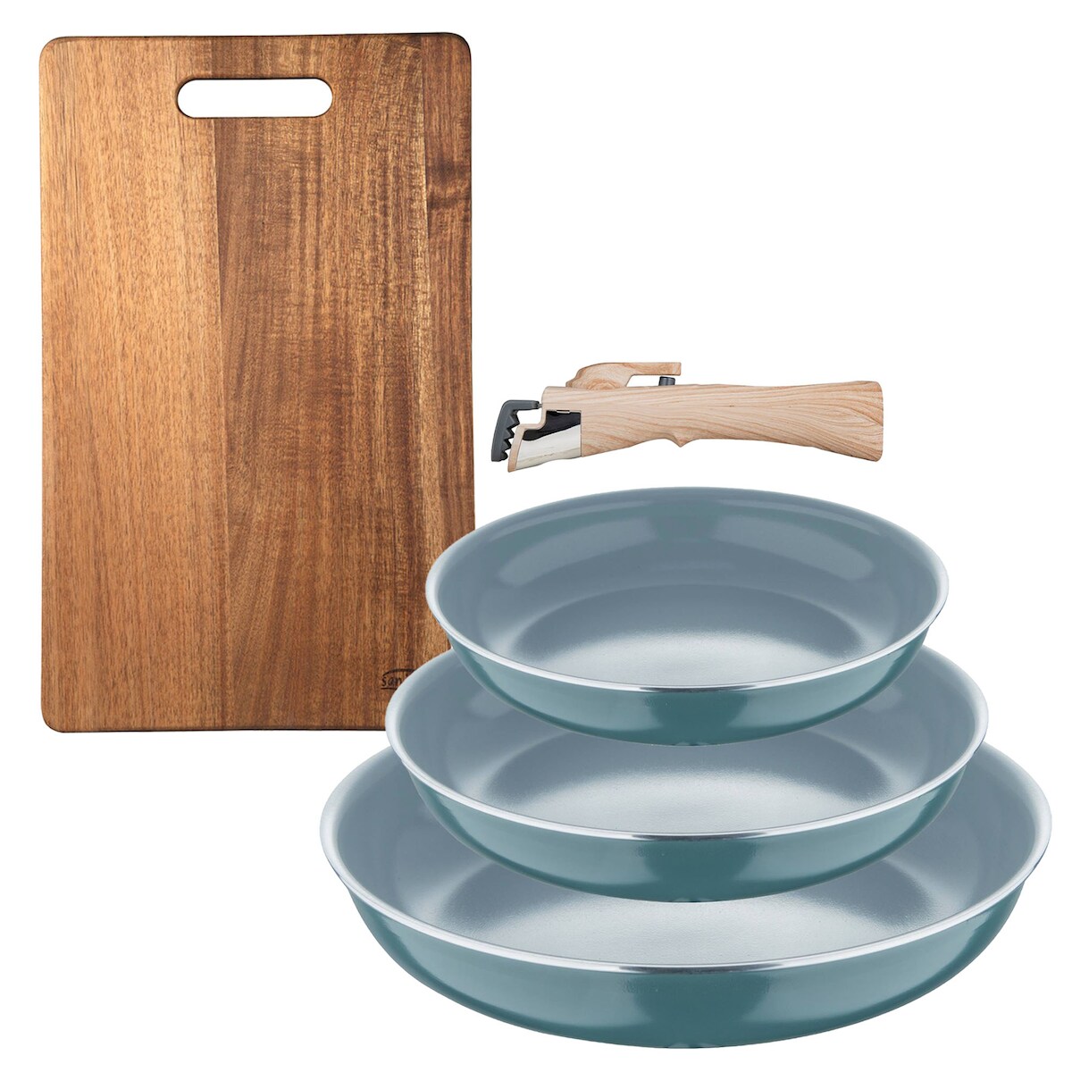 BERGNER - Set aus 3 Pfannen Ø18/20/24 cm recyceltes gepresstes Aluminium Grün mit abnehmbarem Griff mit Schneidebrett 40,3x25,2x2,5cm Holz