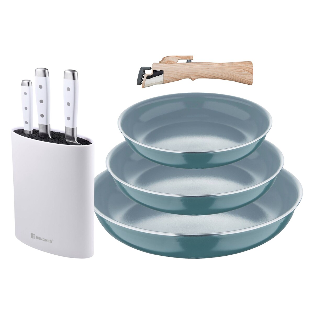 BERGNER - Set aus 3 Pfannen Ø18/20/24 cm recyceltes gepresstes Aluminium Grün mit abnehmbarem Griff mit Set aus 3 Messern mit Tacoma Edelstahl