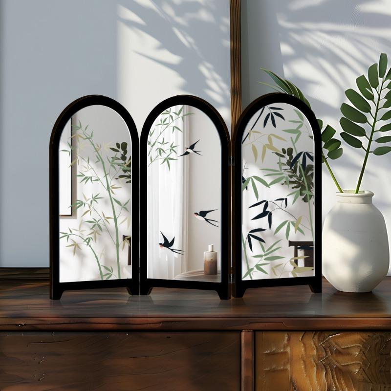 Chinese Design Mid Ancient Style Flower Bird Ink Bamboo Folding Screen Desktop Decoration Tea Table Living Room Decor