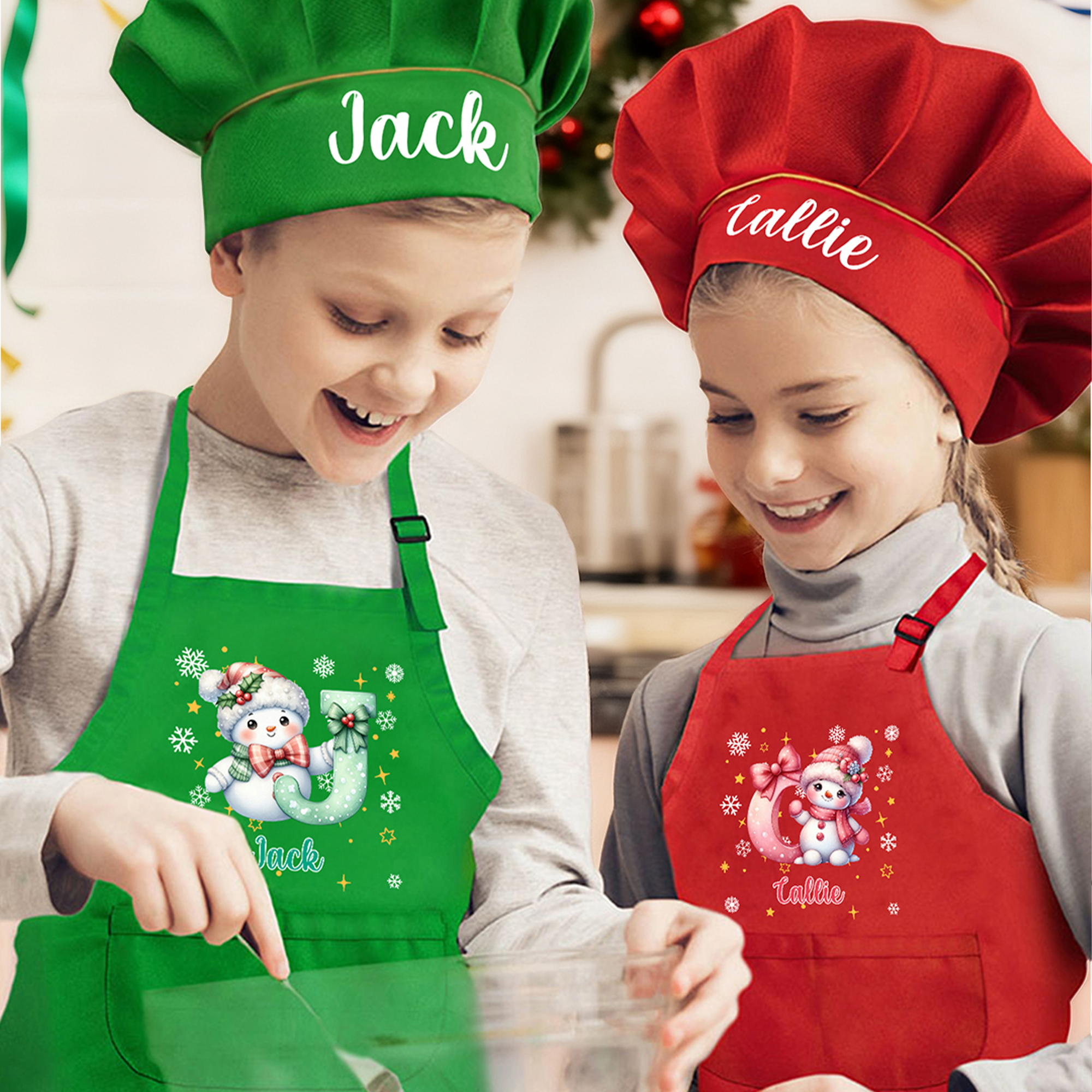 Cappello personalizzato Cartoon Natale Pupazzo di neve iniziale Regalo di Natale per bambini Grembiule da cuoco regolabile con nome e tasca per cucinare