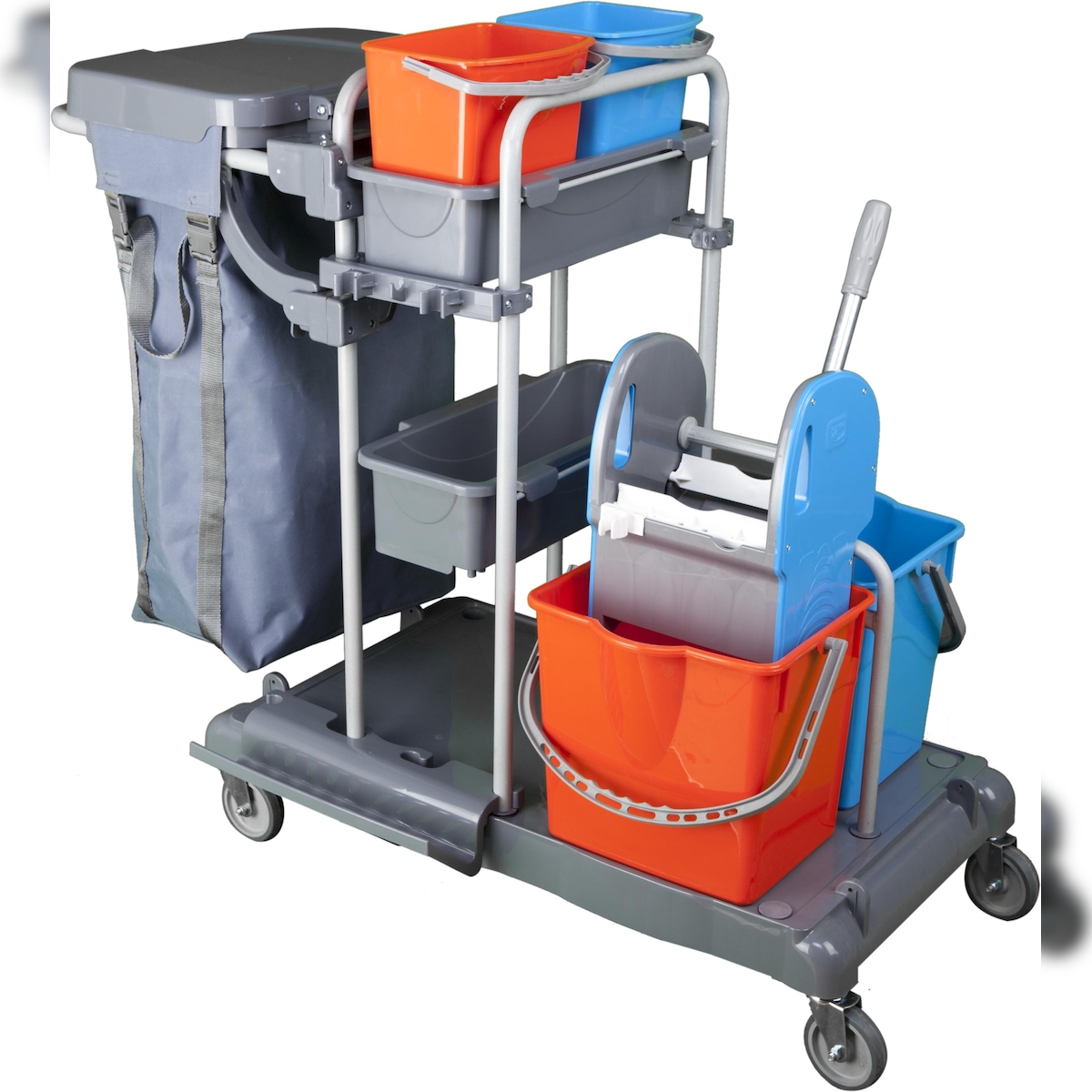 CleanSV® Tyson 4 Profi PE Reinigungswagen, mit Moppresse, 2 x 15 Liter Eimer, 2 x 6 Liter Eimer, 2 Ablagen, Müllsackhalter