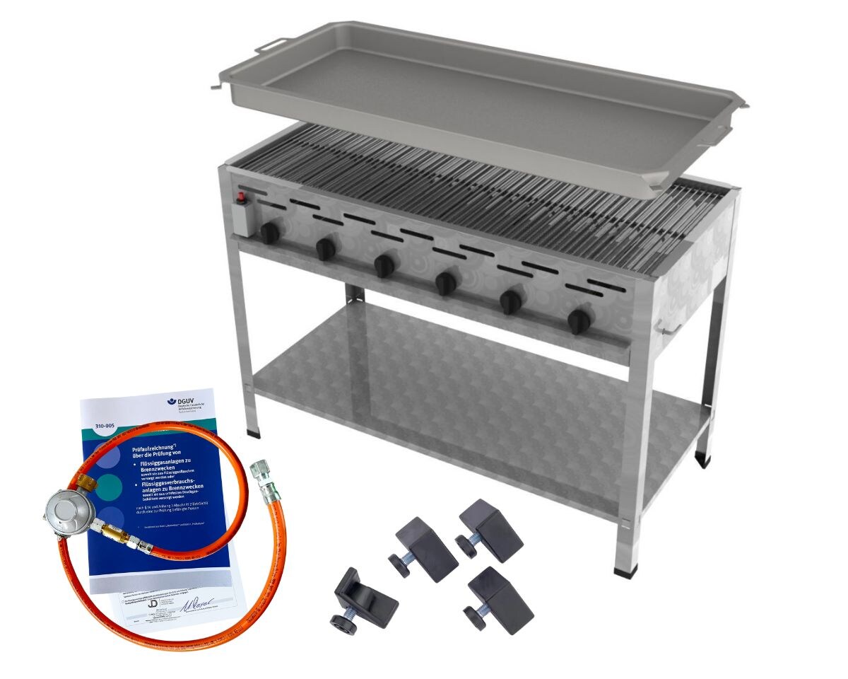 ChattenGlut Gasbräter 6-flammig 27kW Standgerät Rost und Stahlpfanne mit DGUV