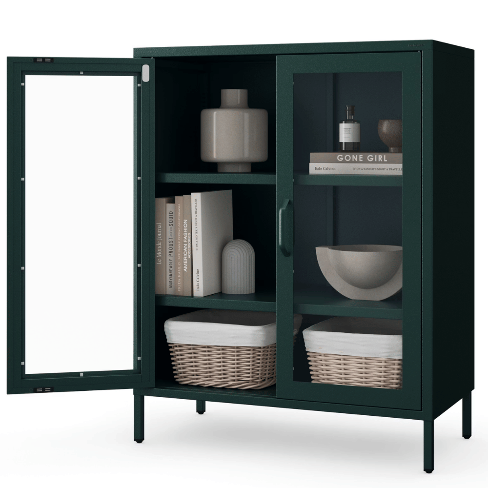 DELUKE Vitrinenschrank Wohnzimmer klein EKER - 3 Ebenen, Metall | Glasvitrine Bücherschrank Büroschrank Aktenschrank mit Glasfenster 101,5x80x40cm Dunkelgrün