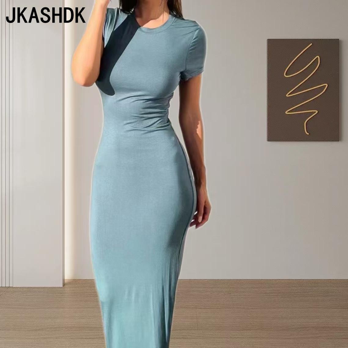 JKASHDK Women's Fashion Summer Spring Solid Color Print Short Sleeve O-Neck High Waist Casual Dresses cm light grey