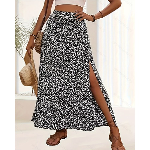 Per donna Gonna Elegante Moda Casual Maxi Vita Alta Gonne Floreale Stampato Con Spacco Micro-elastico Elasticizzato Quotidiano Streetwear Nero Rosa Estate Poliestere