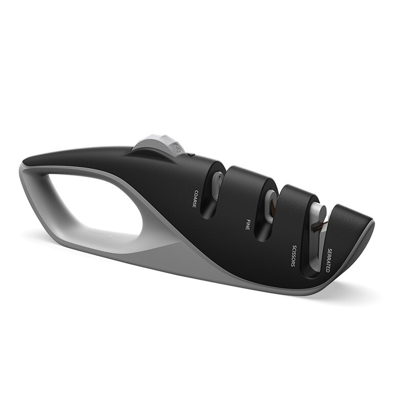 Messerschärfer RÖSLE, schwarz, B:4,8cm H:7,5cm L:20cm, Kunststoff, Messerschärfer, Messerschärfer, 3 Stufen, Schleifkopf wechselbar, stabiler Stand, ergonomischer Griff